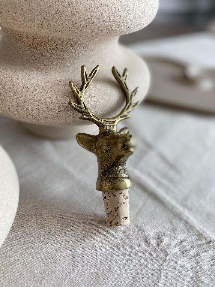 Parlak altın renkte geyik başı figürlü, mantar tıpalı şişe aksesuarı. Şişelere dekoratif bir görünüm katar.