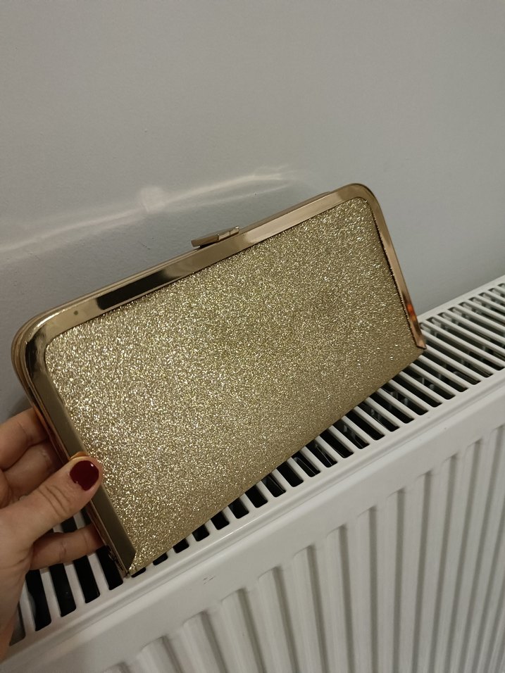 Parlak altın renkli, simli yüzeye sahip kadın portföy çanta. Desensiz, çağdaş tasarıma ve dayanıklı plastik malzemeye sahiptir. ✨