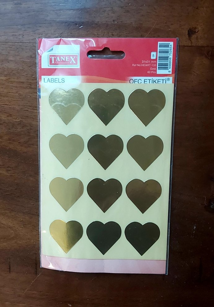 Altın renkli, parlak kalp şeklinde üzerinde 'LABELS, OFC ETiKETi' yazısı bulunur.