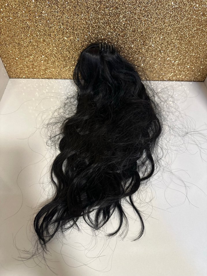 Satenimsi siyah dalgalı, kürklü detaylı, parlak altın arka planlı avant-garde gotik saç aksesuarı. ✨