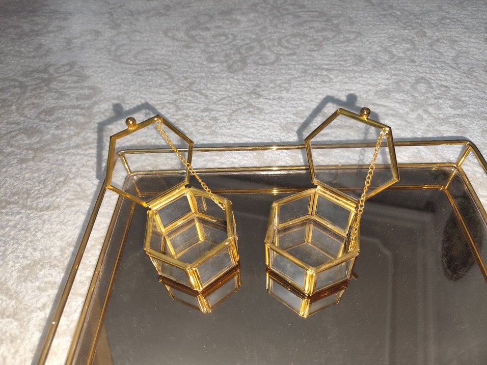 Parlak altın renkli, cam panelli geometrik tasarımlı makyaj organizeri. ✨ Tekli gönderilecektir.