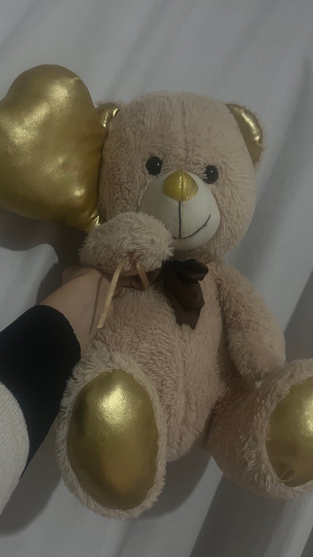 Yumuşak peluş ayıcık, parlak altın renkli kulaklar, burun, pati ve kalp aksesuarına sahiptir. Kahverengi fiyonk ve siyah gözleri bulunur.