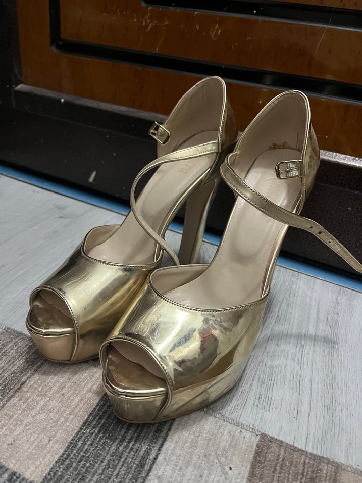 Altın parlak platform topuklu, tokalı kayışlı, çağdaş tarzda, düğünlere uygun kadın abiye ayakkabı. Klasik zarafeti ve ışıltıyı birleştirir.