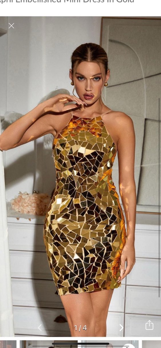 Parlak cam detaylı , straplez yakalı, altın renkli, vücuda oturan mini kokteyl elbisesi. ✨yurtdışından özel geldi.