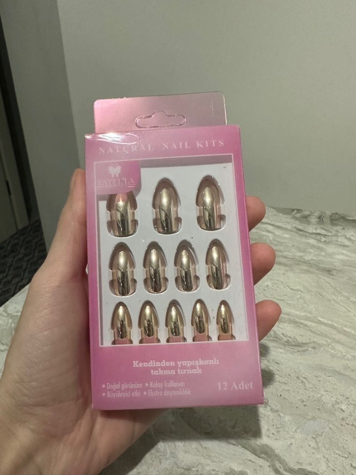 Parlak altın renkte, 12 adet kendinden yapışkanlı takma tırnak seti. Kolay uygulanır ve doğal görünüm sağlar.