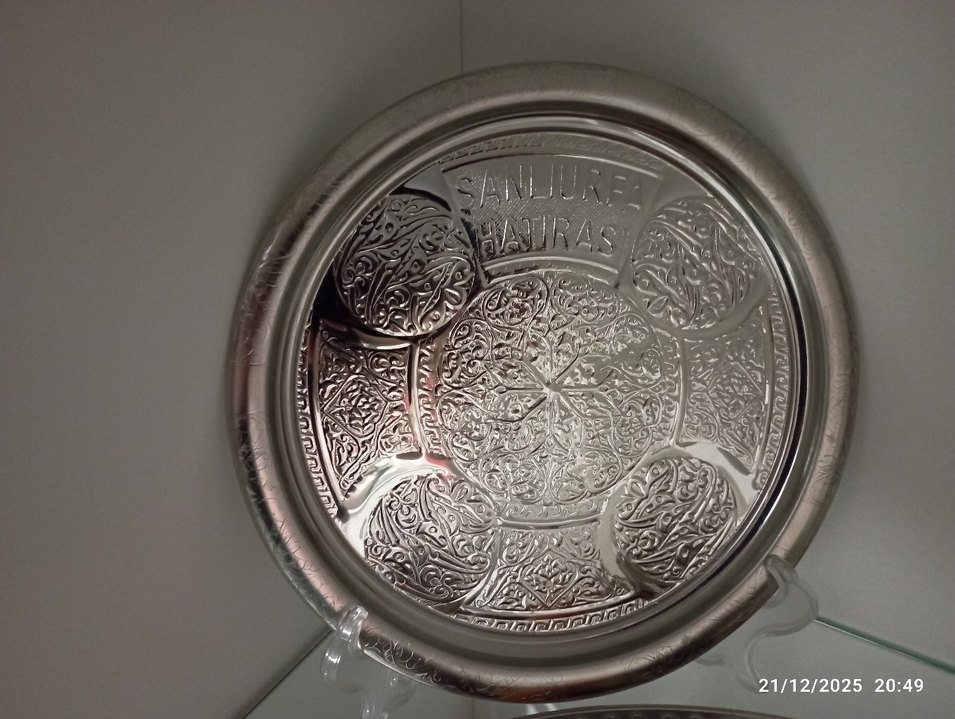 Parlak altın renkli, yılan desenli ve detaylı işlemeli tepsi. Üzerinde 'AIRA' yazısı bulunur.