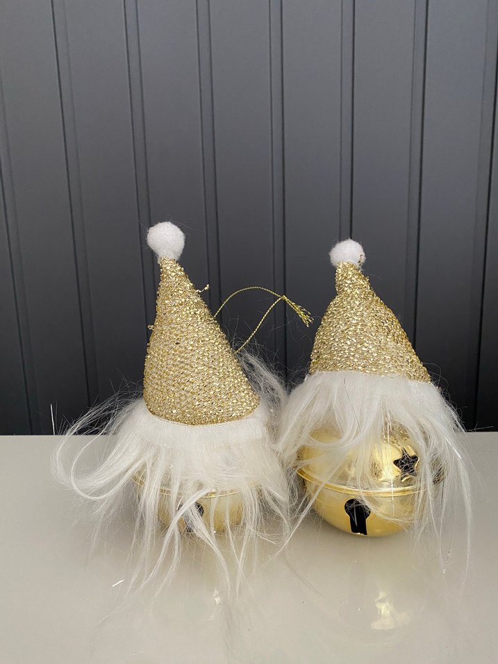 Beyaz yapay kürk ve altın simli şapkalı parlak altın çanlar, yılbaşı süslemeleri için uygundur.İçinde çanı mevcuttur hiç kullanmadım şapka dahil yaklaşık 12 cm adet fiyatı 100 tl iade yoktur #altın#top#yılbaşısüsü#yılbaşı#çan#asker#şapka