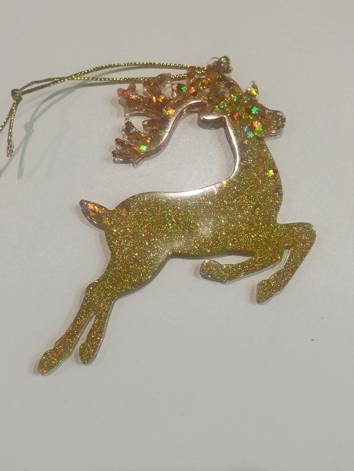 Parlak detaylara sahip, renkli altın geyik yılbaşı süsü. Asmak için ipli, dekorasyon için uygun.