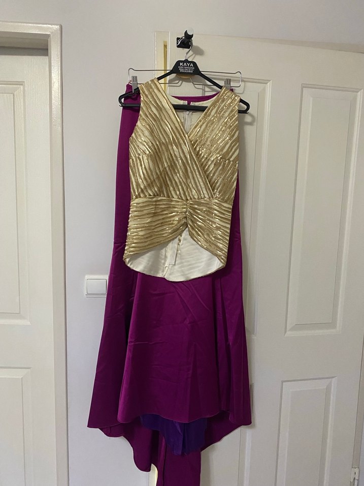 Altın payetli drapeli bistüyer ve mor saten balık etek