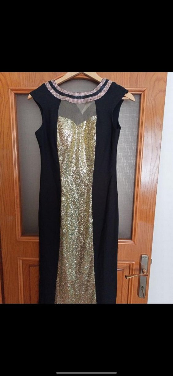 Sırtı siyah, ön kısmı altın payetli, kolsuz ve V yakalı uzun abiye elbise, modern ve şık tasarıma sahiptir. ✨