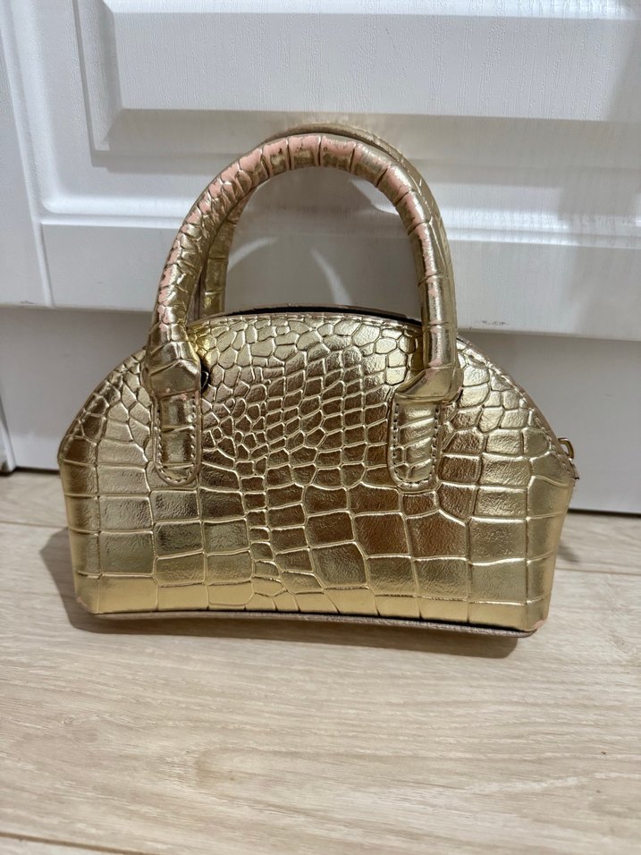 Altın renkli deri yılan desenli, tokalı saplara sahip kadın çanta, klasik zarafetle çağdaş stili birleştirir. Günlük kullanıma uygundur.