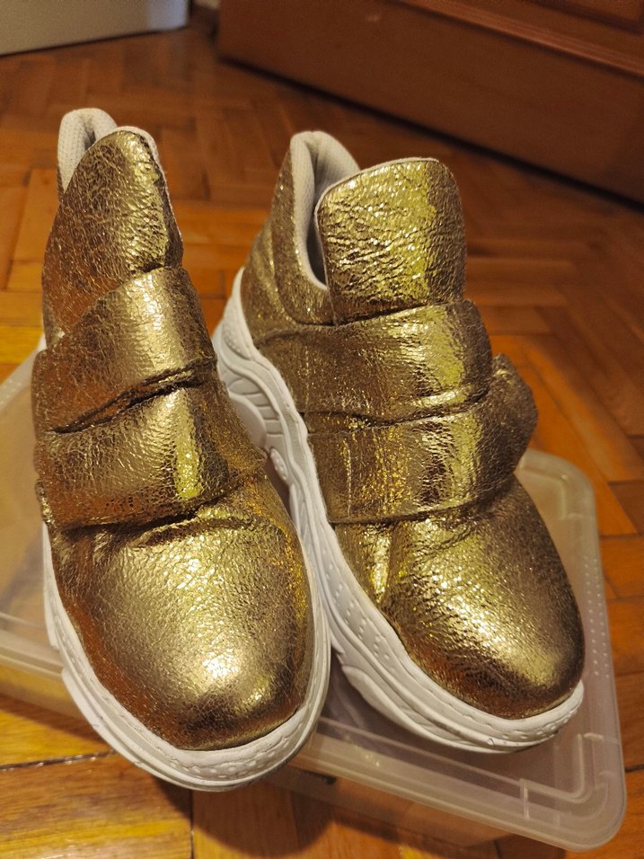 Altın renginde, dolgu topuklu ve tokalı kadın spor ayakkabısı. Parlak kauçuk malzemeden üretilmiş, sportif sokak tarzına uygun 36 numara tertemiz