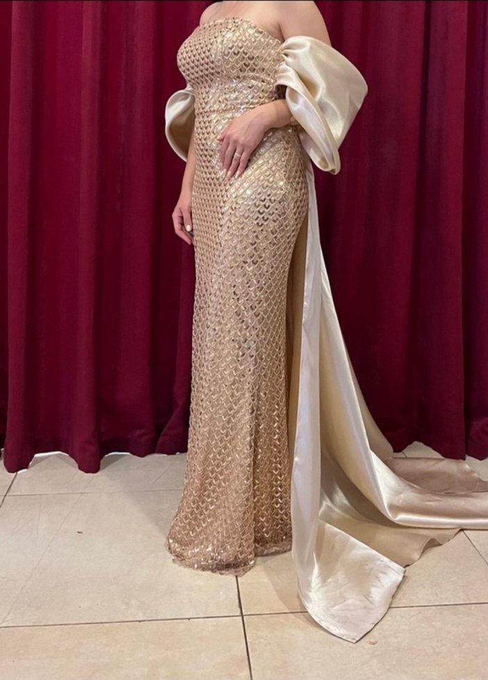 Drapeli ve vücuda oturan bu straplez abiye, parlak altın renkli yılan derisi desenine sahip, modern klasik tarzda, düğünler için uygundur. ✨