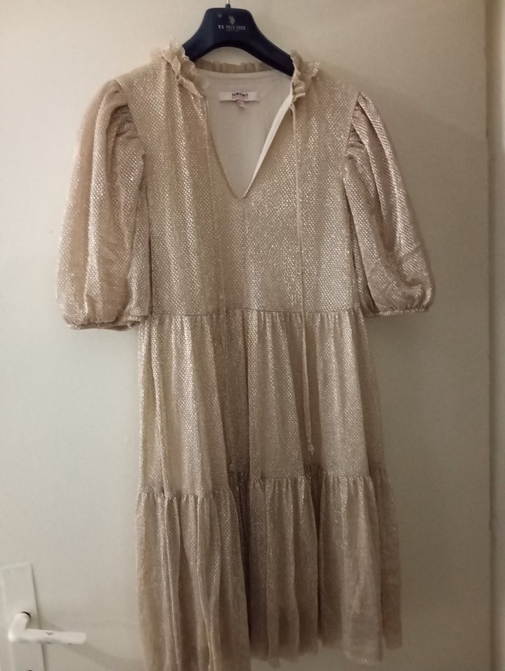 Parıltılı bej kumaştan, V yakalı ve kısa kabarık kollu elbise. Salaş kesim ve fırfır detaylarıyla bohem tarzını yansıtır, düğün için uygun. beden ölçüleri, omuzdan etek ucuna kadar boy 87 bel 44 koltuk arası 44