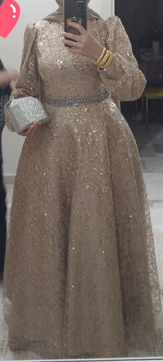 Altın rengi Gold Pullu Boncuklu Uzun Kollu Abiye Elbise