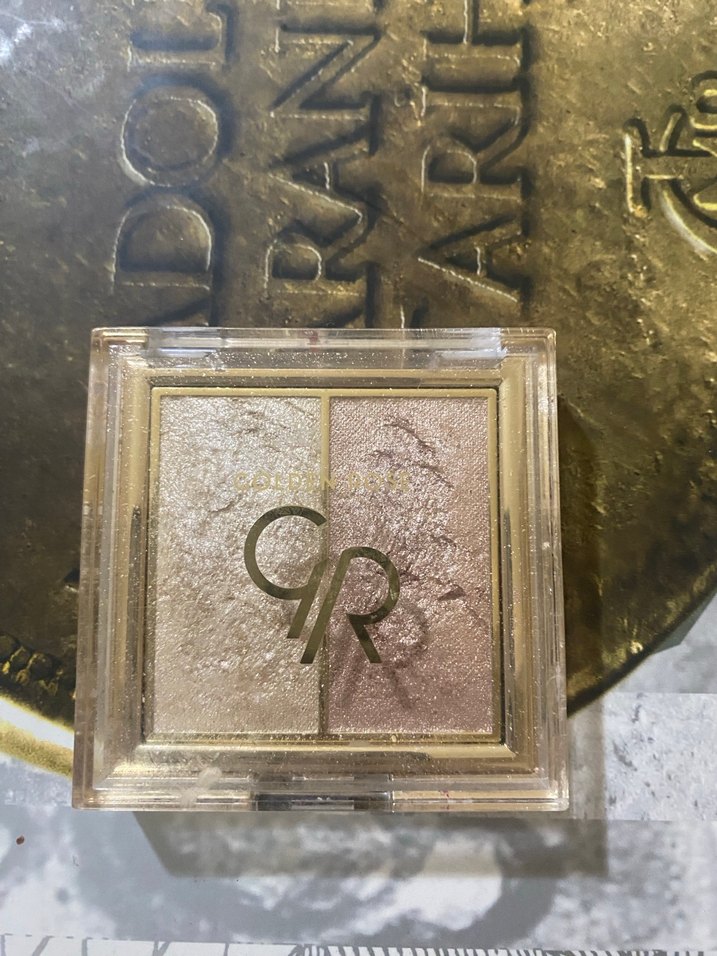Altın renginde, hafif ışıltılı iki tonlu allık, şeffaf kutuda sunuluyor. ✨
