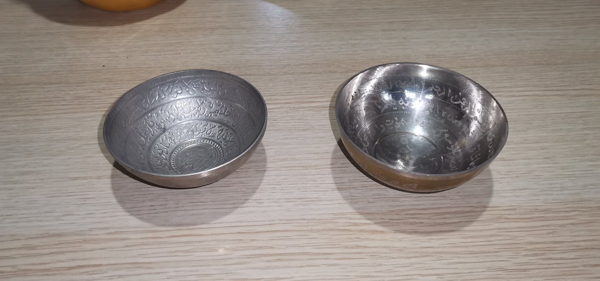 İşlemeli detaylara sahip, altın renk tonlu gri metalden yapılmış iki kase seti. Masa veya dekorasyon için uygundur. ️
