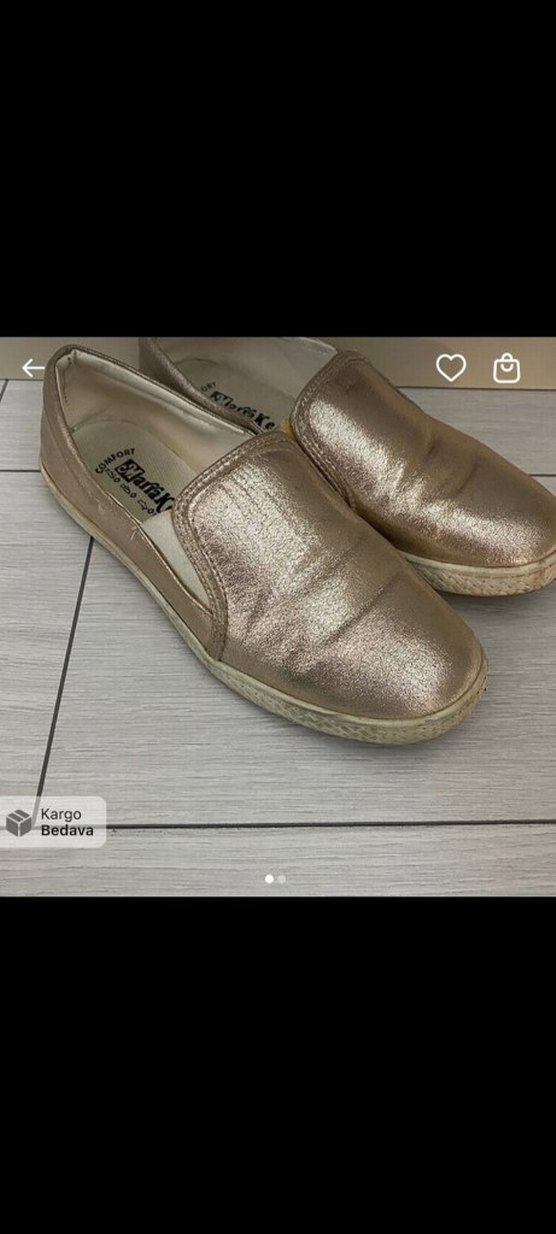 Altın renkli, dolgu topuklu kadın espadril ayakkabı. Kauçuk malzeme ve cırt cırt detaylı, günlük sokak stiline uygun parlak tasarım.
