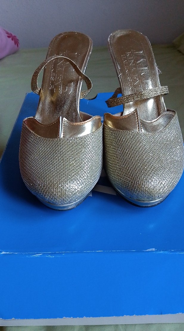 Altın renginde, kemerli dolgu topuklu kadın abiye ayakkabılar. Parlak yılan deseni ve klasik şıklık sunar. Düğünler için uygun, kauçuk malzemeden yapılmıştır.