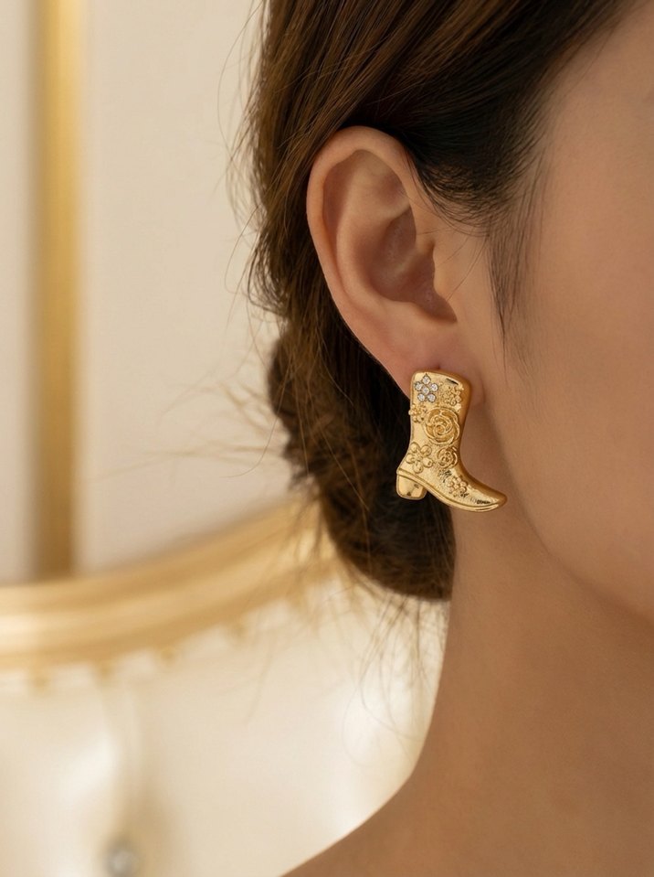 Detaylı işçilikle altın renkli, tokalı kovboy botu şeklinde küpeler. Bohem tarz ve klasik şıklığı bir araya getirir. Düğünler için uygun.