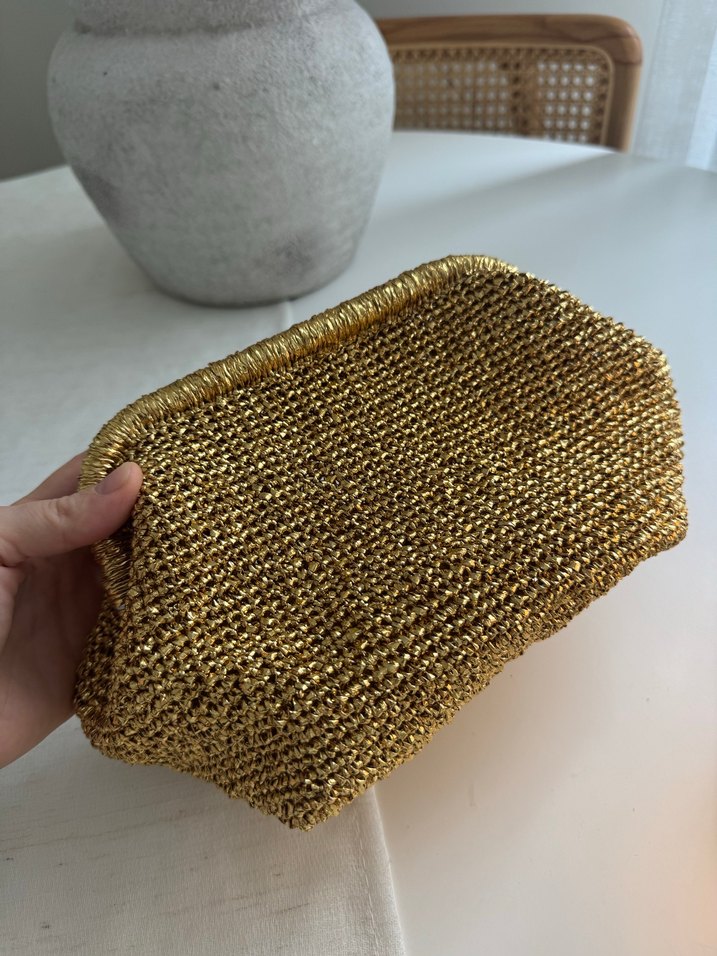 Parlak altın renkli örgü iple yapılmış, bohem tarzda kadın portföy çanta. Vintage ve desensiz görünümüyle günlük kullanıma uygundur. ✨ölçü 20 en 20 uzunluk tabanla