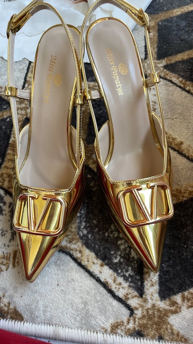 Altın rengi parlak, yılan desenli stiletto topuklu, tokalı ve modern klasik tarzda kadın ayakkabı. Romantik akşamlar için uygun.