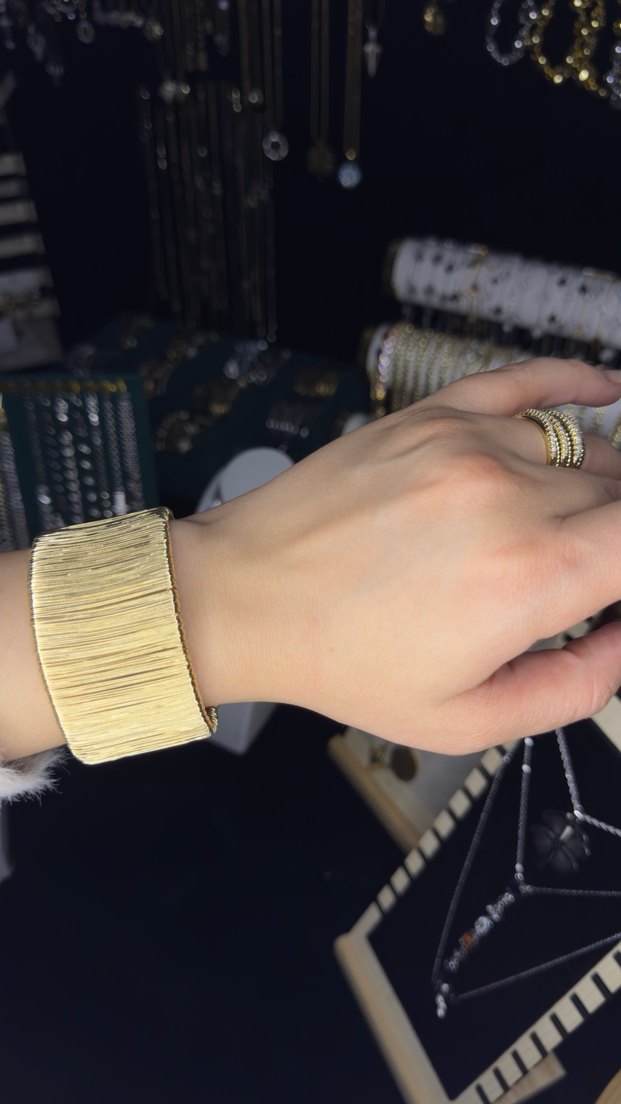 Altın renginde, parlak yüzeyli, pileli tasarıma sahip bohem tarzda kadın bileklik. Günlük kullanıma uygundur. ✨