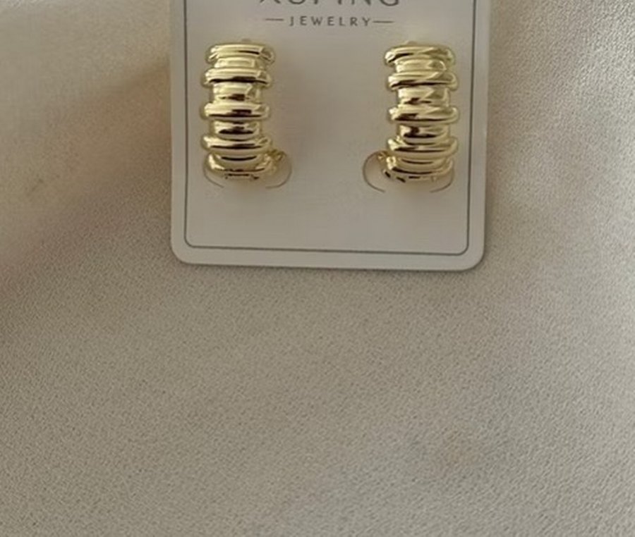 Altın renginde, pilili ve parlak yüzeye sahip midi uzunlukta minimalist, çağdaş küpeler. Romantik akşamlar için uygundur. EWELR işaretlidir.