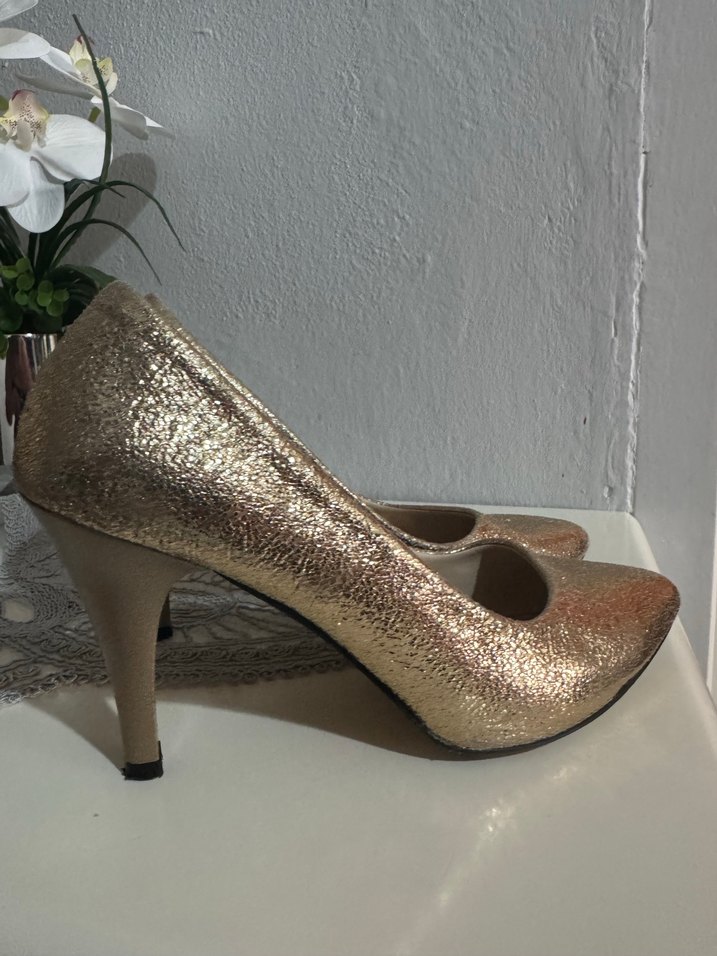 Parlak altın renkli, yılan desenli ve tokalı stiletto topuklu kadın ayakkabısı. Düğün ve özel günler için uygundur.