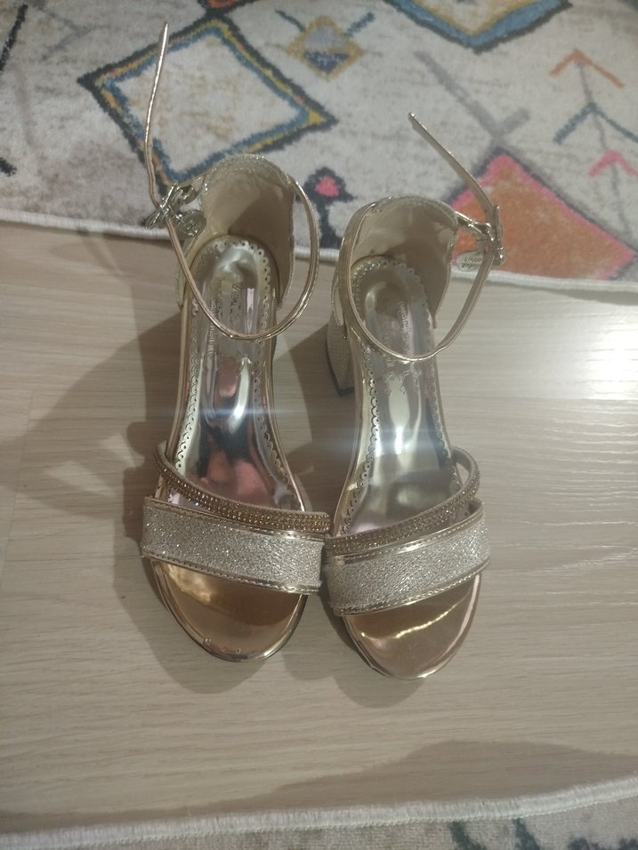 Altın rengi, desenli parlak topuklu kız çocuk ayakkabıs Tokalı kayışlarıyla klasik ve şık bir görünüme sahiptir. 1 kere düğünde giydirdim şu anda olmuyo hiç bir sorunı yok bilekten takmalı ayarlanabılır ayarlama tokasını tutturma yeri. bır kere ayarlayınca daha duzeltmenıze gerek yok direk küçük çengel kısmına takıyosunuz