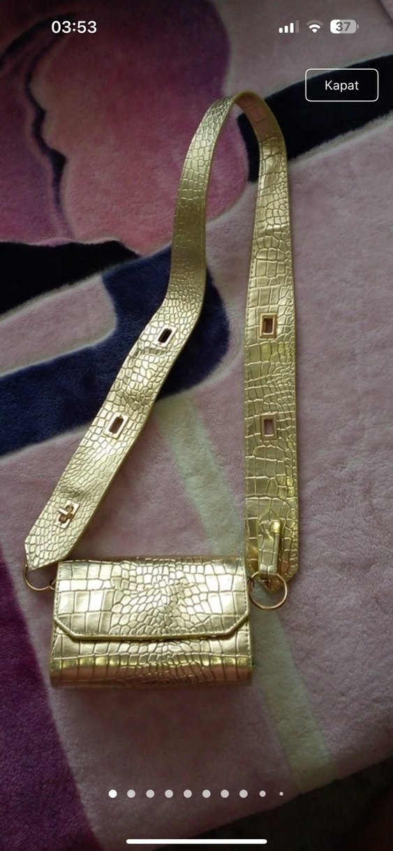 Yılan derisi desenli, altın renkli parlak deri kadın çanta, tokalı askısıyla sokak modasına uygun.