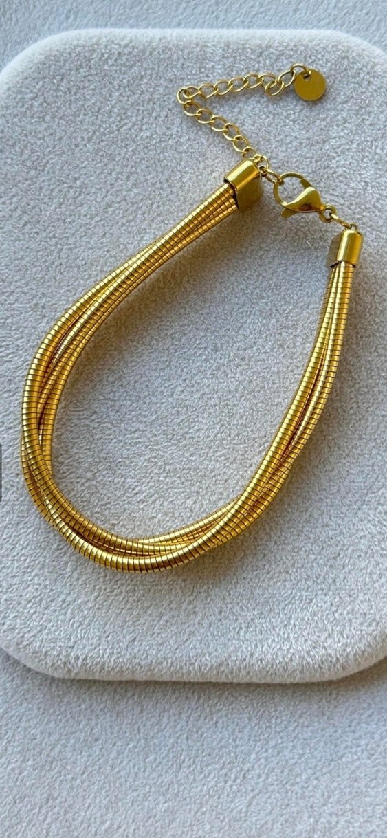 Parlak altın renkli kadın bilekliği, yılan desenli detaylı zincir tasarımıyla çağdaş ve minimalist bir şıklık sunar.