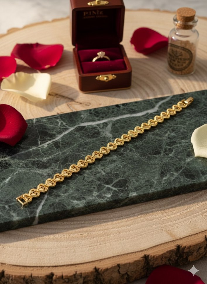 Düğünler ve minimal tarzlar için uygun, altın renkli ve zincir detaylı kalp desenli kadın bileklik.