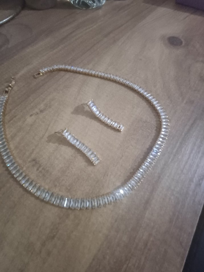 Kadınlar için zincir detaylı, beyaz taşlı takı seti, zarafeti modern tarzla buluşturur, zincir kısadır ona göre alabilsiniz.