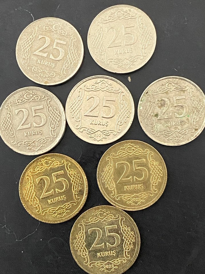 Altın renkli, "25 Kuruş" değerini taşıyan ve geleneksel desenlere sahip vintage tarzda rozetler. Koyu, eski görünümlü.