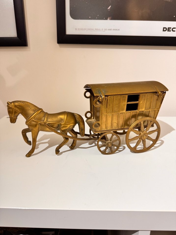 Parlak altın renkte, tekerlekli ve pencereli at arabası çeken detaylı at figürü. Ölçü verildi