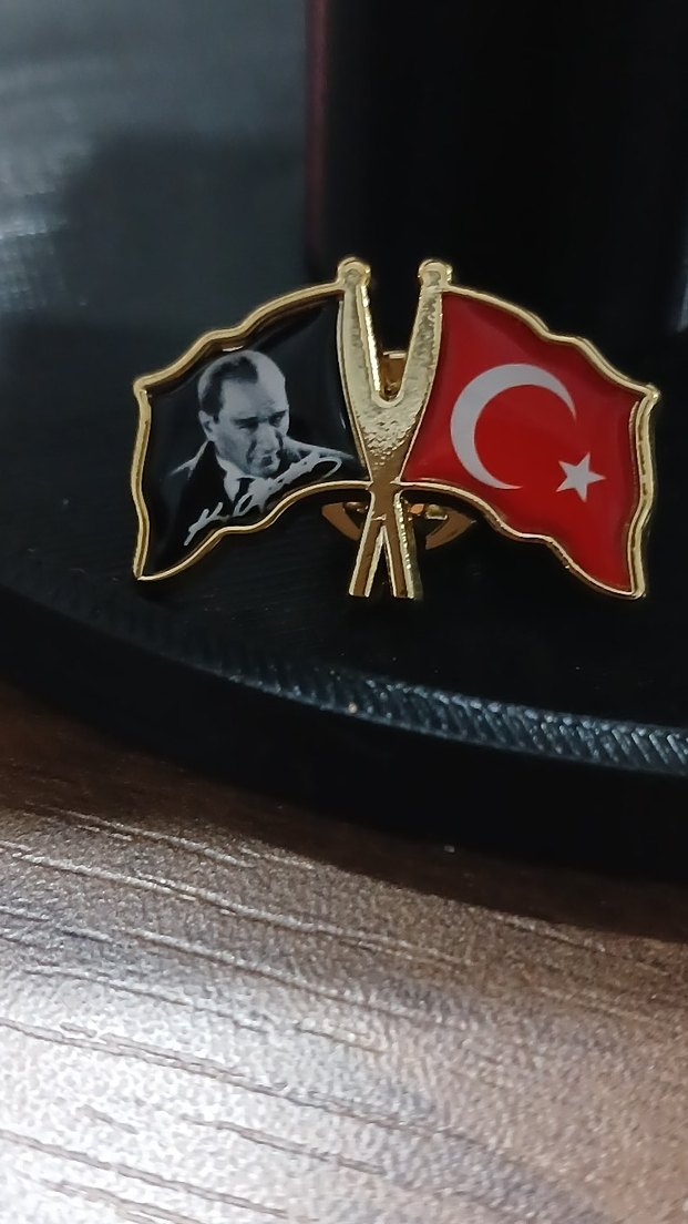 Altın renginde, Atatürk ve Türk bayrağı figürlü, klasik ve geleneksel erkek rozeti. Koyu arka planlı tasarım.