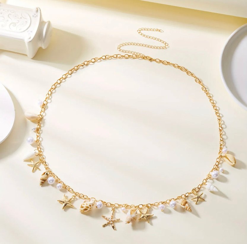 Altın renk zincir deniz kabuğu süslemeleriyle bohem tarz bel zinciri, yeni paketli