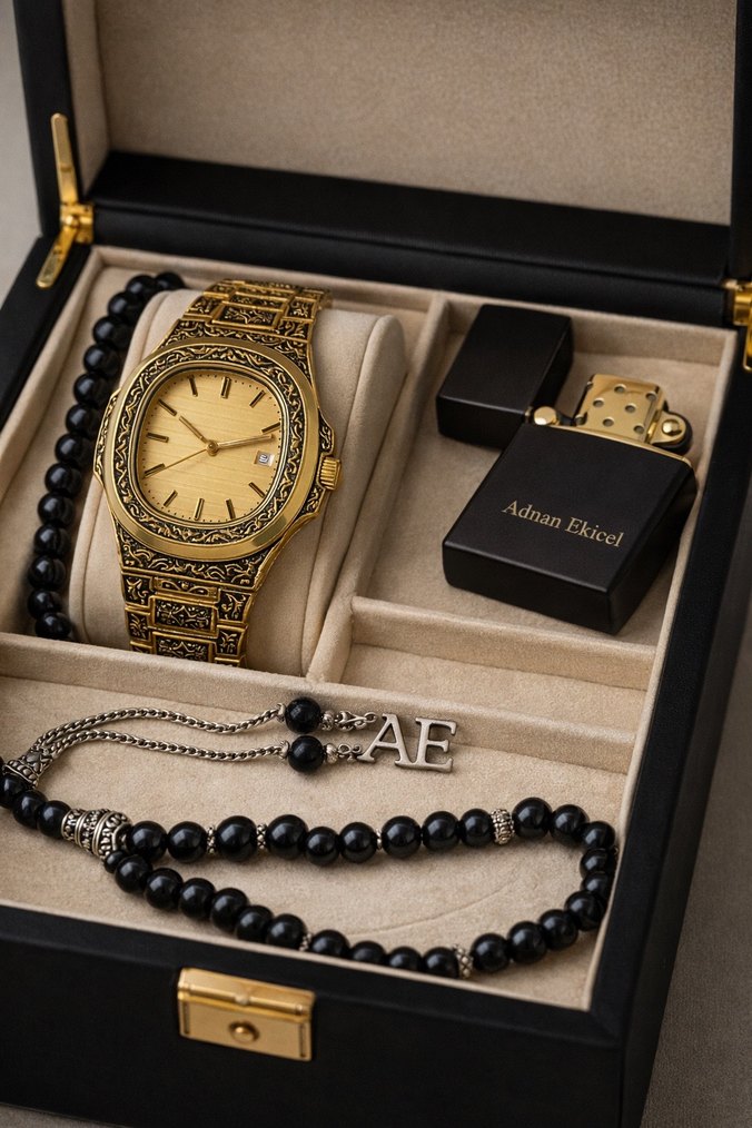 Erkekler için koyu altın renginde bohem işlemeli saat. Set, "Adnan Ekicel" yazılı çakmak, boncuklu bileklik ve siyah boncuklu kolye içerir. ⌚