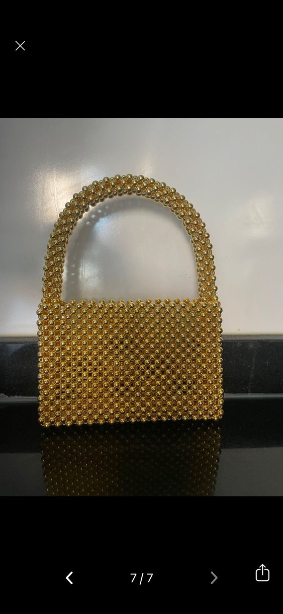 El Emeği Plastik malzemeden yapılmış, parlak altın renk boncuklarla kaplı, klasik ve çağdaş glam tarzını yansıtan kadın çantası. Günlük kullanıma uygundur. ✨Hiç kullanılmamış hemen teslim . Ölçüler görselde mevcuttur