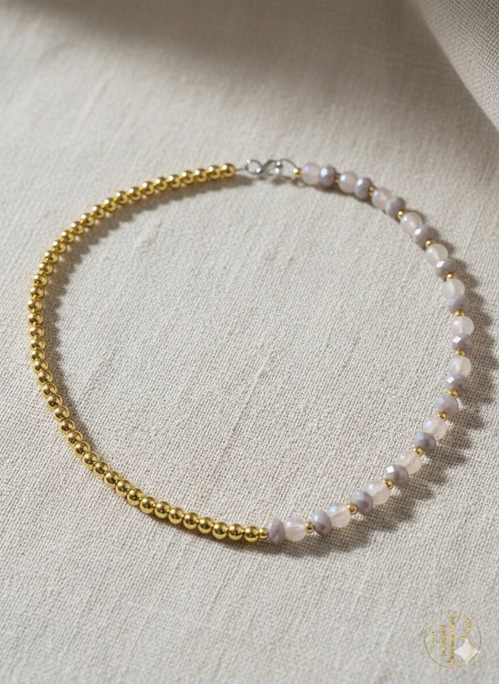 Altın ve cam boncuklardan oluşan, minimalist ve çağdaş tasarıma sahip günlük kullanıma uygun kadın kolye.✨