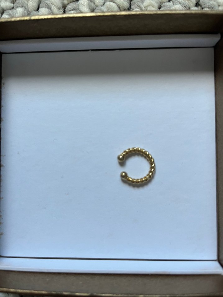 Altın renginde, boncuklu tasarıma sahip parlak kulak manşeti. Minimalist ve sade tarzıyla romantik akşamlar için uygundur.