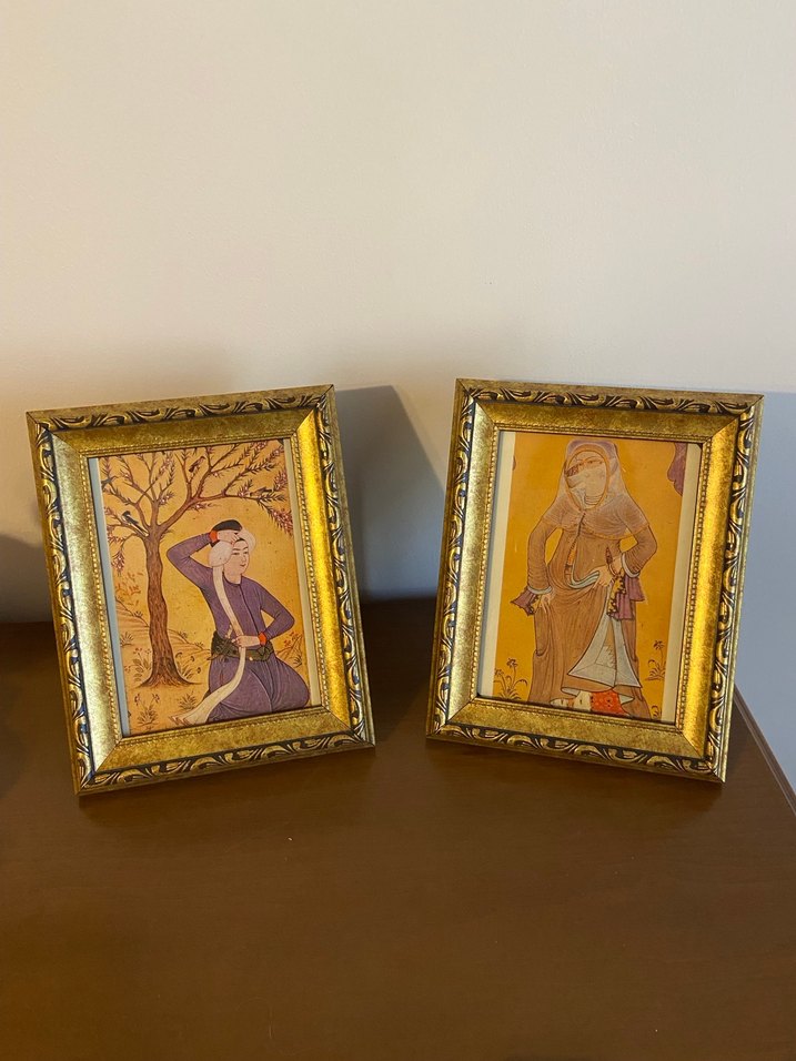 İki adet altın renkli çerçevede, koyu tonlarda geleneksel figürler ve detaylı arka planlarla süslenmiş sanat tabloları. Baskı resim adet fiyatı 250 tl