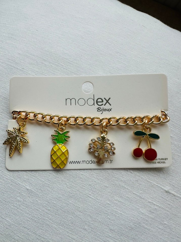 Renkli meyve ve çiçek figürlü altın renk zincirli kadın el zinciri, bohem tarz için uygun.