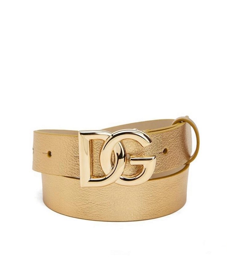 Parlak altın renkli deri kayış ve tokalı DG logosu ile kadın kemeri, minimalist ve çağdaş tarzı trend günlük görünümle buluşturuyor.