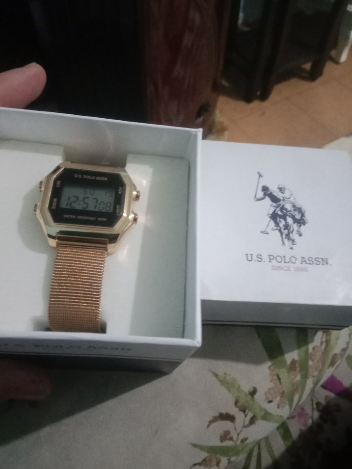 U.S. Polo Assn. markalı, altın renkli, bel kemerli dijital kadın kol saati. Vintage ve streetwear tarzına uygun. ⌚