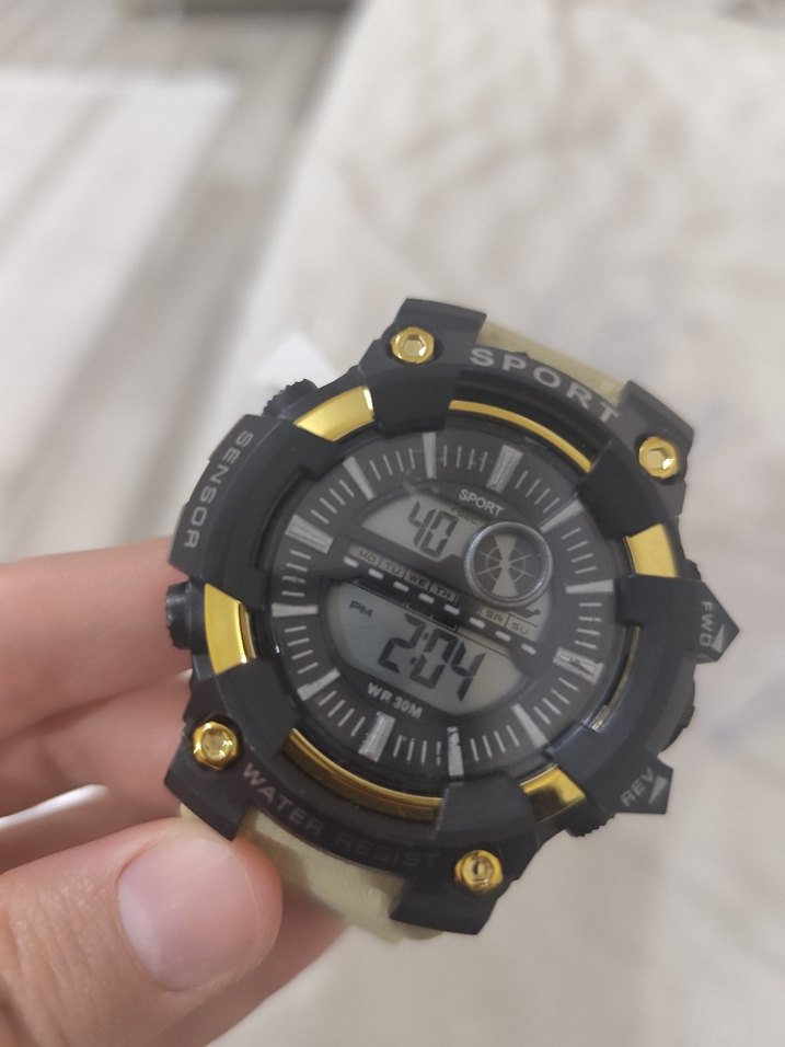 Bu erkek spor saati, koyu altın renkli kasa ve dijital ekran ile 2:04 zamanını gösterir. Su geçirmez ve spor fonksiyonlarına sahip dayanıklı tasarım. ⌚