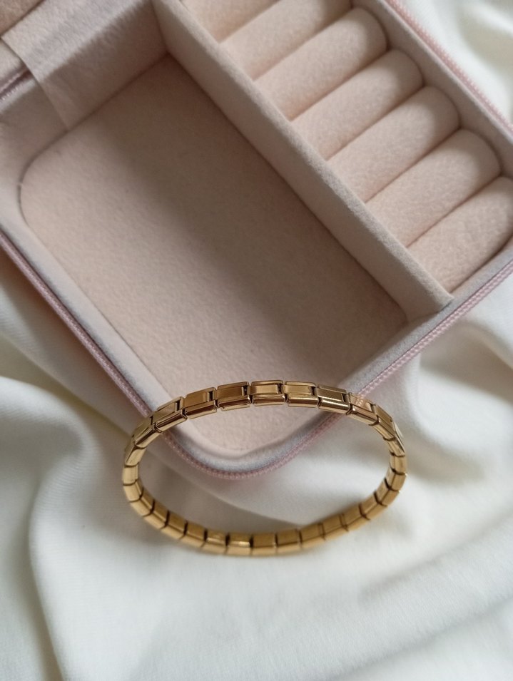 Parlak altın renkte elastik tasarımlı, günlük kullanıma uygun minimalist ve çağdaş kadın bilekliği. ✨