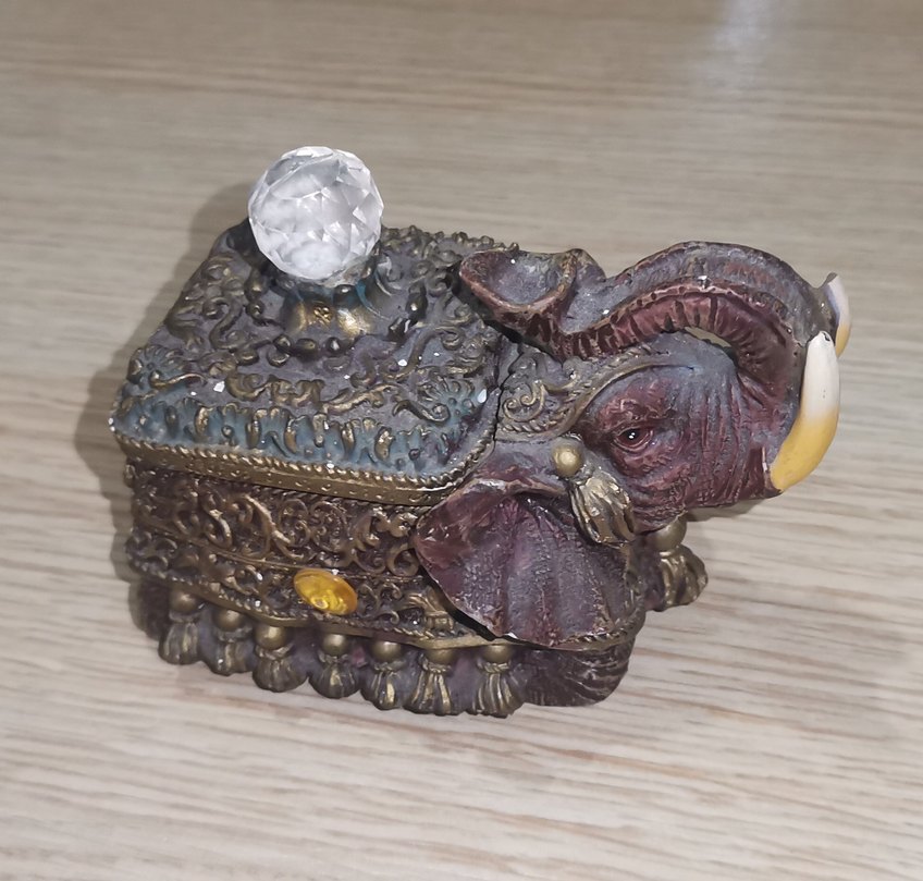 Altın detaylı koyu renk fil figürlü dekoratif kutu, üzerinde şeffaf kristal düğme bulunur.