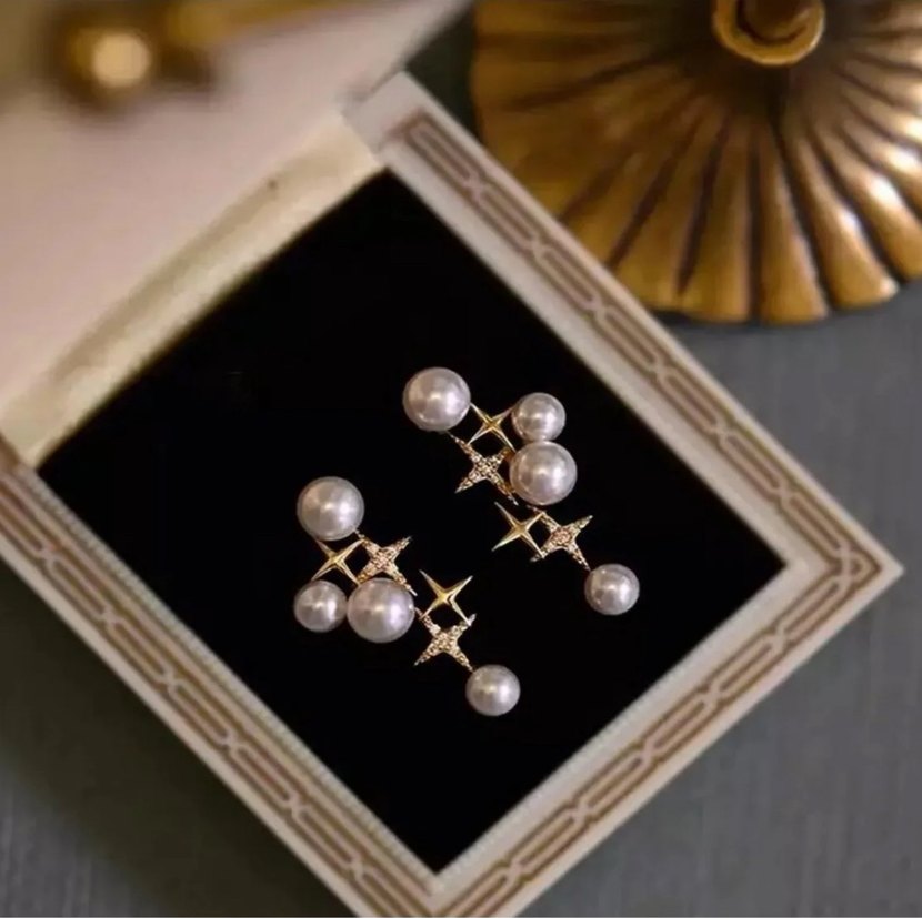 Altın renkli, boncuklu inci ve nakışlı yıldız detaylı kısa küpe, partiler ve günlük kullanım için uygun. ✨